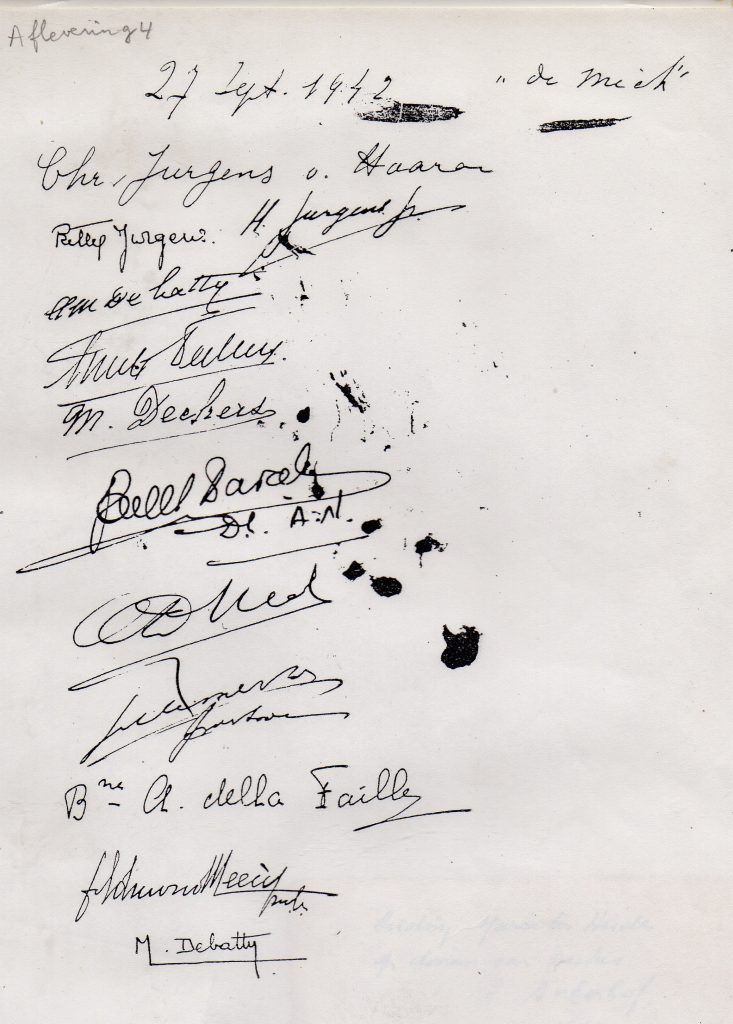 Dit is de enige bladzijde die is overgebleven van het guldenboek met de handtekeningen van de genodigden ter gelegenheid van de feestelijke ingebruikname van het nieuw lokaal op het domein van De Mick op 27 september 1942.