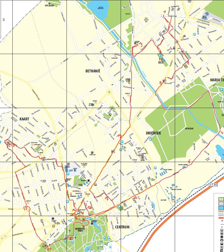 Rechts Max Hermanlei, eerste rechts Stuiversvelden, links Hoge Kaart en onmiddellijk rechts Het Venneke volgen tot de Middelkaart, rechts tot op de Lage Kaart. Oversteken, achter het standbeeld van Hendrik Luyten links de Martouginlei in. Tweede straat rechts Kenislei in, bocht mee volgen tot op de Augustijnslei. Rechts indraaien. Volgen tot links de Aerdenlei, rechts tussen de huizen een kleine straatje, De Zwaan